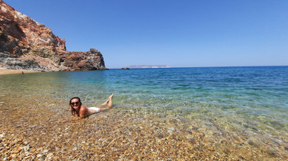 Ci sono alcuni lettini, distanziatissimi, per un relax totale, altrimenti potete mettevi dove più vi piace, oppure camminare al di là un promontorio di roccia rossa e arrivare in una parte di spiaggia completamente selvaggia e disabitata. Se preferite avere qualche confort qui troverete anche un paio di taverne con terrazza vista mare con ottimi menù, prezzi assolutamente onesti, e una vista mozzafiato.